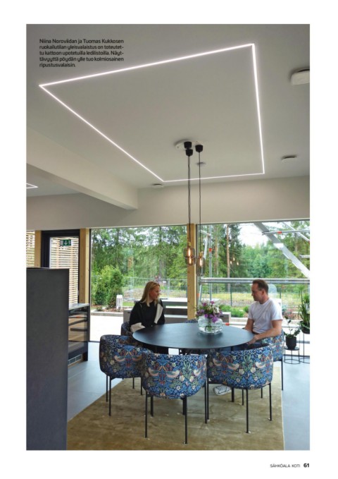 Niina Noroviidan ja Tuomas Kukkosen ruokailutilan yleisvalaistus on toteutet- tu kattoon upotetuilla ledilistoilla. Näyt- tävyyttä pöydän ylle tuo kolmiosainen ripustusvalaisin. SÄHKÖALA KOTI 61