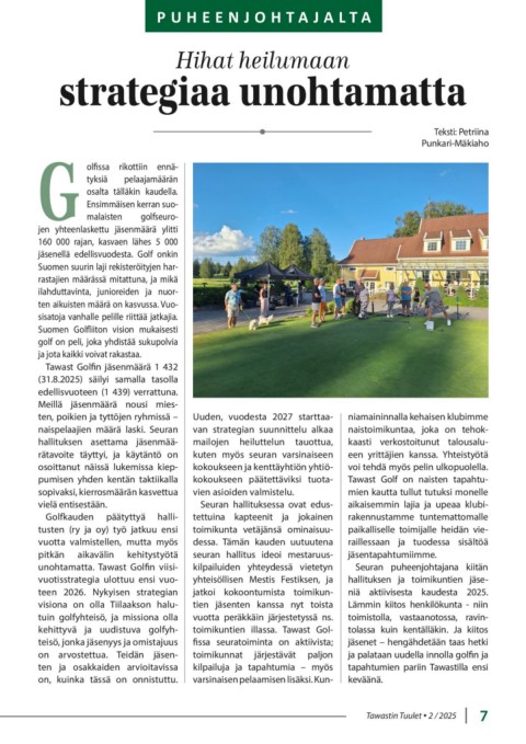 Suomen suurin laji rekisteröityjen har- Seuran hallituksessa ovat edus- Tawast Golf on naisten tapahtu-